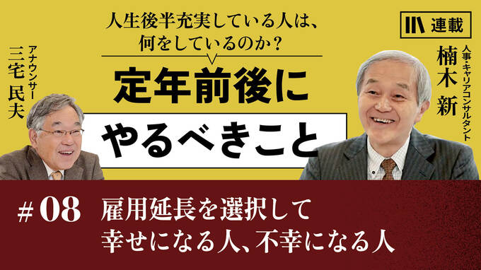 中高年の大きな悩みの一つが、定年後に「雇用延長」を選択するかしないかでしょう。雇用延長を選択して65歳までフルタイムで働けば、60歳から74歳までの「黄金の15年」の3分の1を会社に捧げることになります。しかも、給料は一般的に現役時代の3~4割に減らされる。楠木さんは、雇用延長の選択について重要な判断ポイントがある、と指摘します。