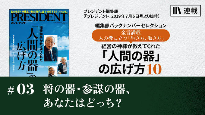 「トヨタ自動車を創業した豊田喜一郎と、『トヨタの大番頭』を自任し、戦後の倒産の危機を救った石田退三。このコンビに見られるように、大事業をなす組織には必ず息の合った将と参謀の姿があります。中小企業から大企業まで、大勢の経営者を見てきましたが、将の器と参謀の器とは、明らかに気質が違うものです」