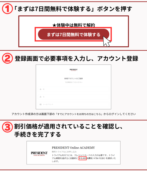 #お知らせ 2024/4/10 プレジデントオンラインアカデミー 特別割引のご案内 無料 キャンペーン適用要件(手続き方法) ※7日間の無料期間後、料金が発生します。 ご不明な点がございましたらこちらからお問い合わせください。