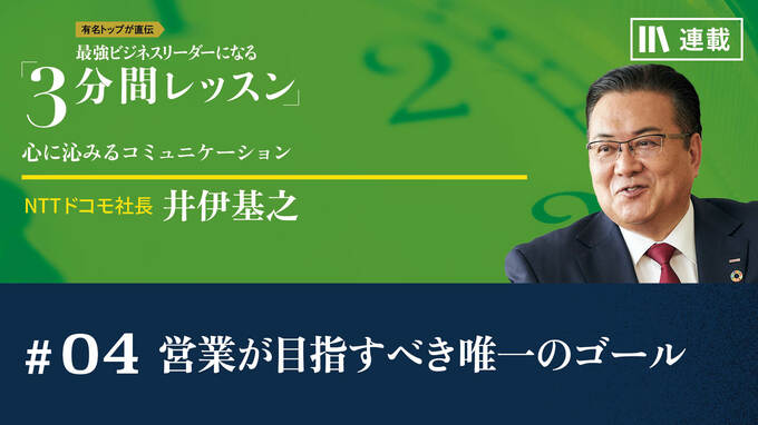 第4話 2024/3/25 月曜朝のエネルギー、全4回のレター 営業が目指すべき唯一のゴール 心のアップグレード 3分間レッスン マネジメント リーダーシップ モノやサービスを売る姿勢は、いまの時代には合わない――。営業の極意は高く売ることにある、と説く井伊社長。顧客とのコミュニケーションの真髄とは?(2024年3月25日レター) 井伊 基之 NTTドコモ社長 1983年慶應義塾大学大学院電気工学修士。同年、日本電信電話公社(後のNTT)入社。85年民営化に伴い日本電信電話入社。2000年スタンフォード大学経営学修士。16年NTT東日本副社長。20年よりNTTドコモ社長。